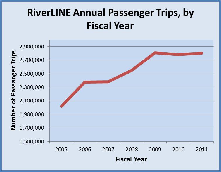 Other than a small decline in ridership in 2010, the RiverLINE has shown a year on year increase in passenger trips since beginning service in 2004 (note: Passenger trip information is not included for 2004, because the RiverLINE only operated for part of this year). The slight decline in passenger trips in Fiscal Year 2010 came as NJ Transit issued a large fare hike, and was in line with the nationwide decrease in public transit ridership during that period, which has been attributed to persistently high unemployment. Notably, the RiverLINE saw a 10.05% increase in passenger trips in FY 2009, while nationwide public transit ridership declined by 3.8% during the same period (New Jersey’s unemployment rate at that time was in line with the overall US rate).