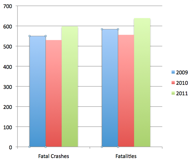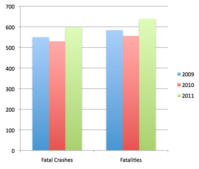 2011’s increase in fatal accidents and fatalities reverses a trend for the state—the numbers reached a peak in 2006, at 709 fatal crashes and 771 fatalities, and had been falling since 2007.