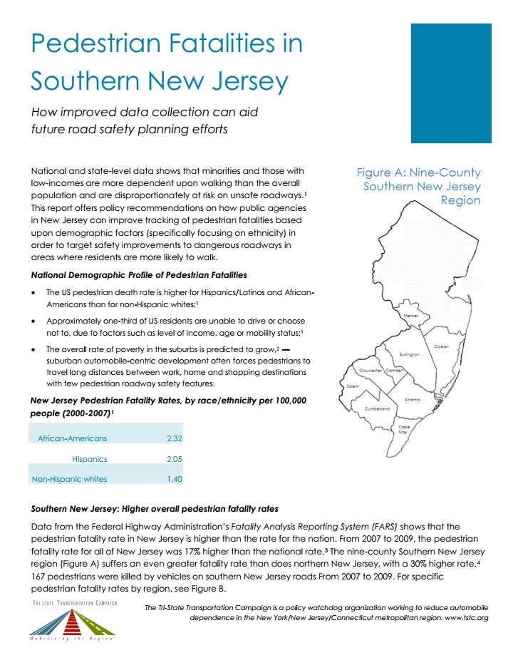 TSTC’s report looked into a nine-county South Jersey region (Mercer, Burlington, Ocean, Gloucester, Camden, Salem, Atlantic, Cumberland and Cape May counties), which had a 30 percent higher pedestrian fatality rate than the northern portion of the state for the period between 2007 and 2009, and found that reliable demographic data, other than gender and age, is unavailable at this scale.