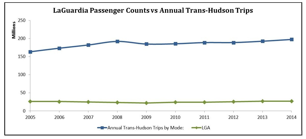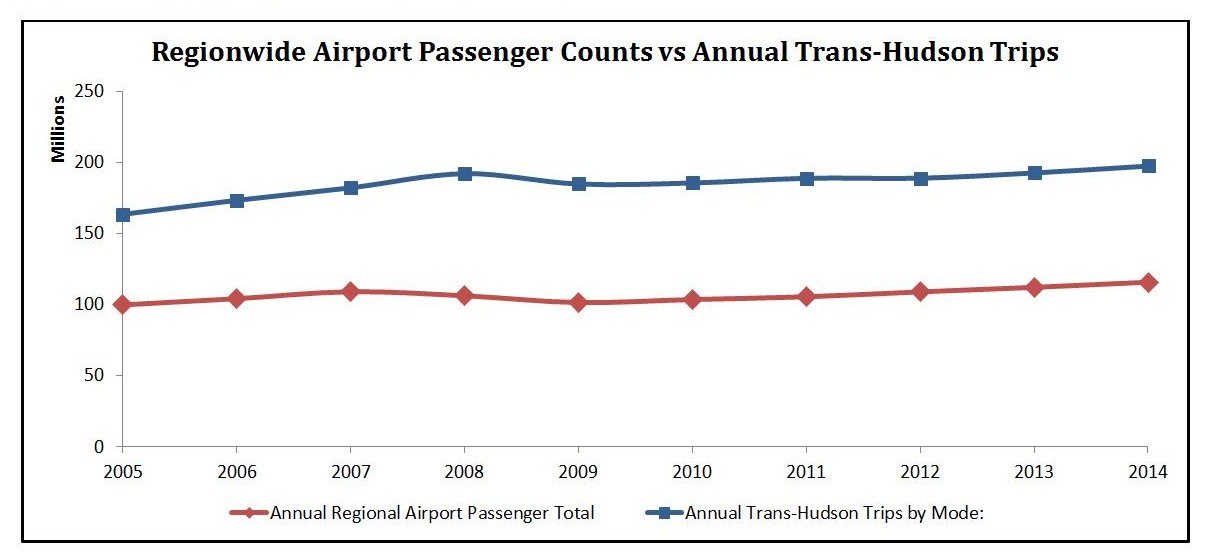 Lower trans-Hudson trips greatly surpass annual passenger counts even when considering the three major regional airports serving the New York area. In 2014, the combined passenger totals at Newark Liberty, John F. Kennedy, and LaGuardia airports added up to just over 115 million people–just over half of all transit trips across the Hudson.